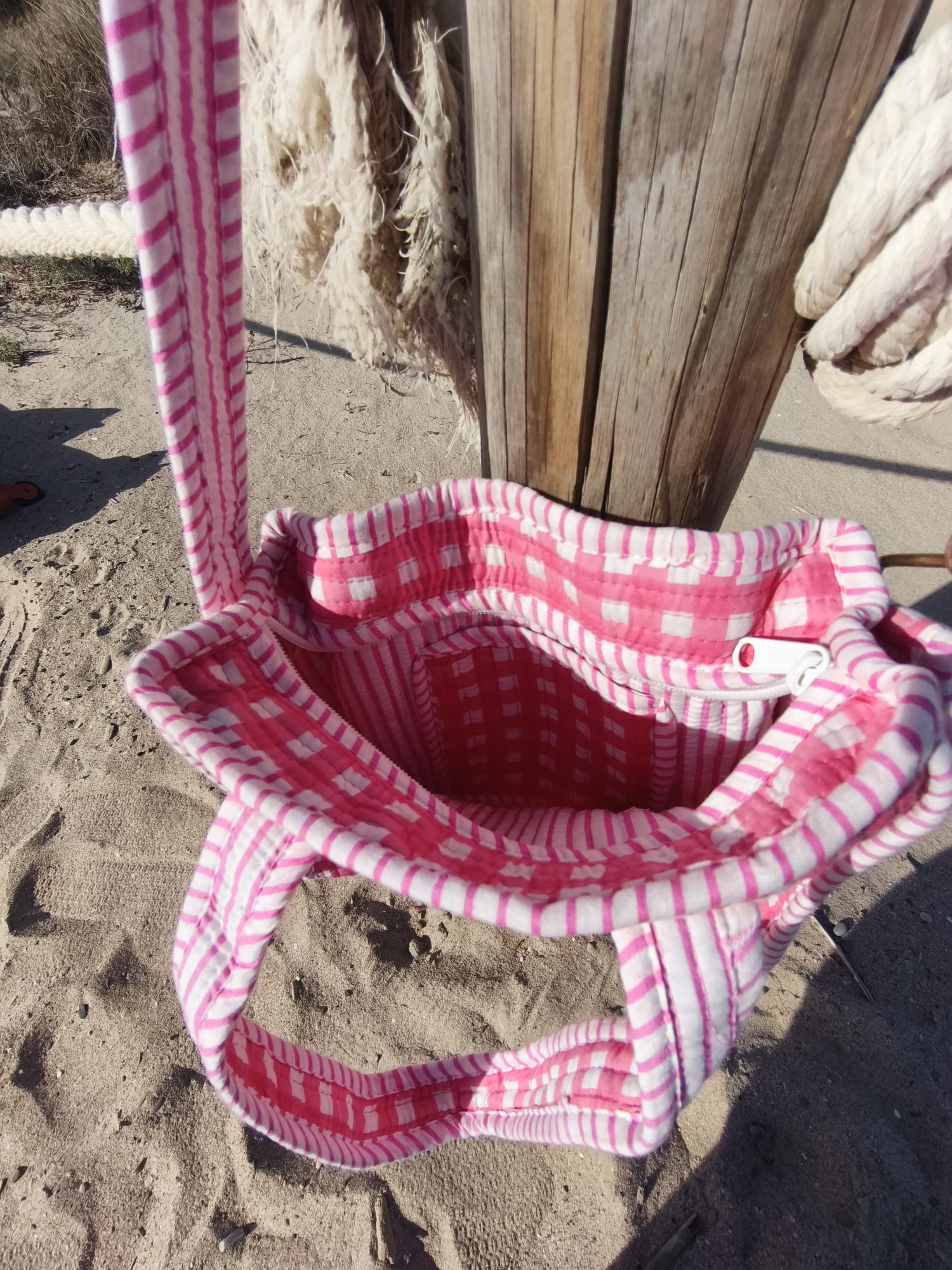 Malva es una bolsa pequeña pero sorprendentemente espaciosa, confeccionada en 100% algodón con la técnica artesanal block print en un delicado cuadro rosa y blanco. Se cierra con cremallera y puedes llevarla al hombro con su correa ajustable o en la mano por su asa. En el interior incluye un bolsillo para mantener tus esenciales siempre organizados.